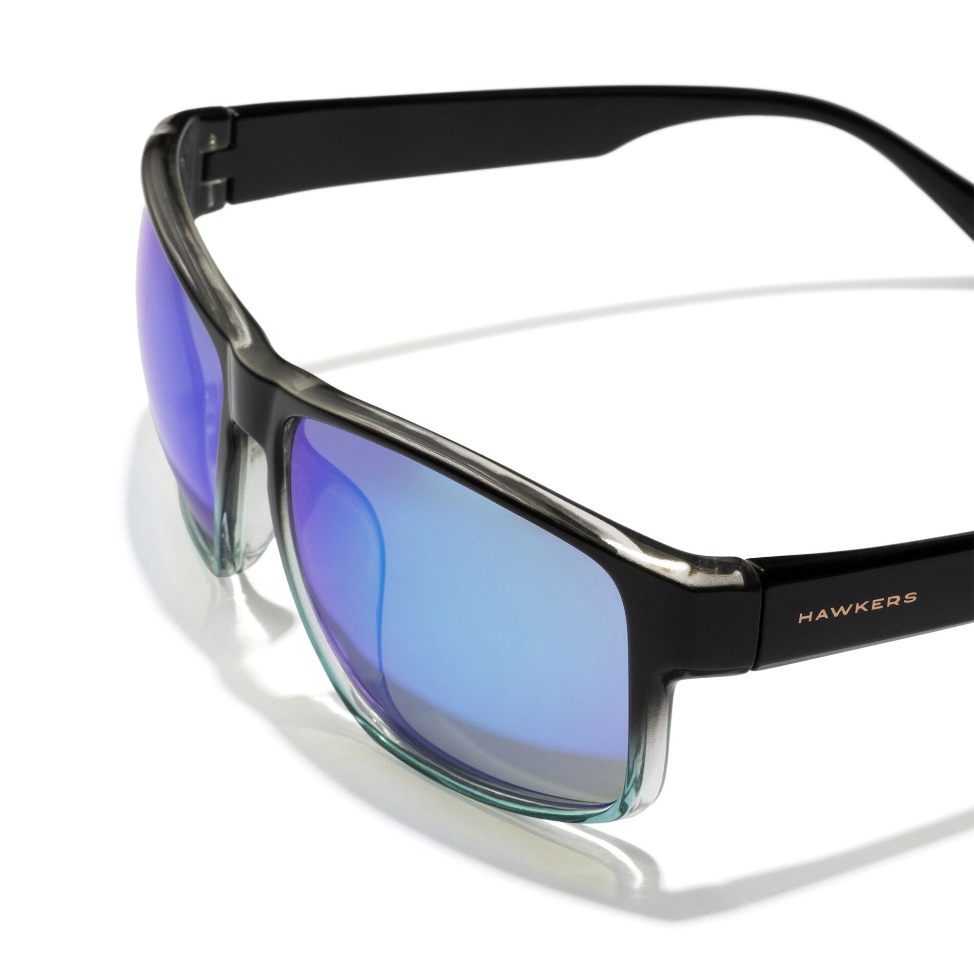 90s-inspired wraparound effect sunglasses with polished black temples and upper rims, which fuse into the clear blue lower rims. The mirrored lenses have the same clear blue tone.