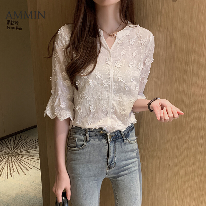 AMMIN new short-sleeved Lace shirt For embroidered white cotton flared sleeve Top lady top