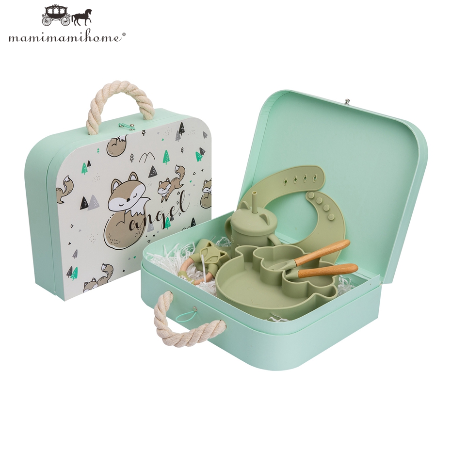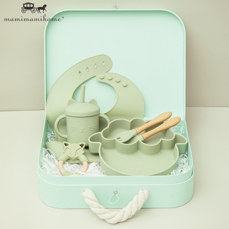 Mamimami Home Baby Feeding Set 6pcs 100% Soft Silicone Bib,Sippy Cup,Suction Plate with Box Best Kids Gift