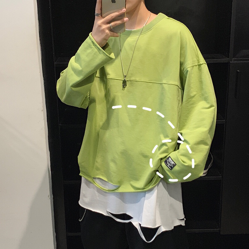 Hong Kong Style Ins Super Hot Fake Two-Piece Sweater Men's Korean-Style Trendy Loose Handsome Personality Ripped Bottoming Shirt Men Harajuku