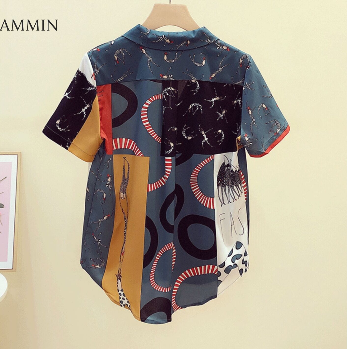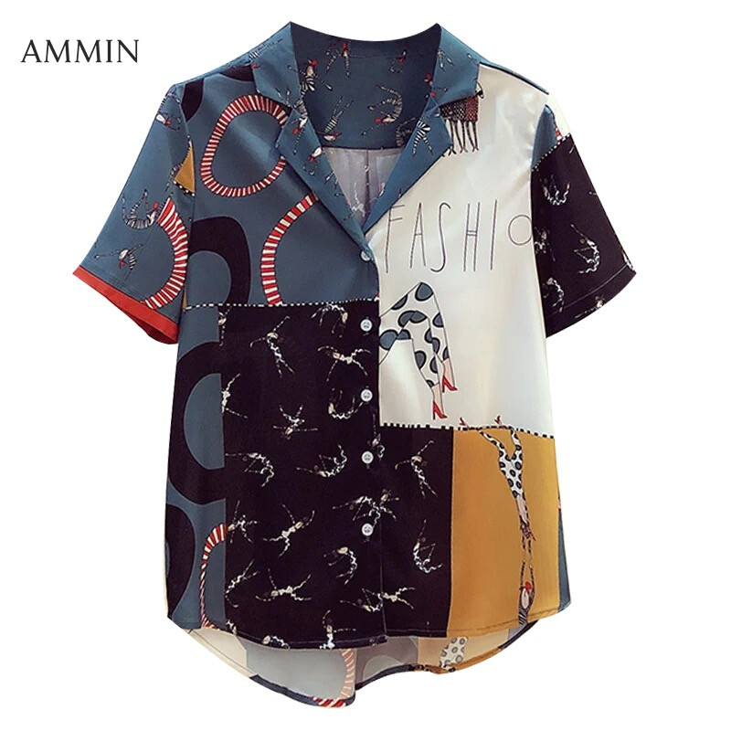 AMMIN Tops 2021 summer new item fashion retro Hong Kong flavor v-neck printed button cardigan chiffon shirt women's short-sleeved single-breasted design blouse