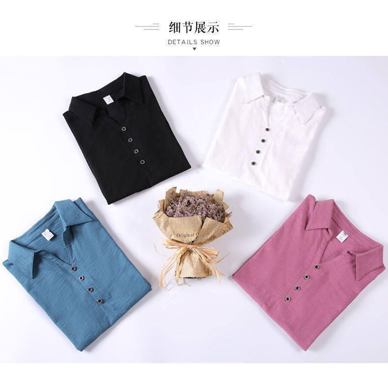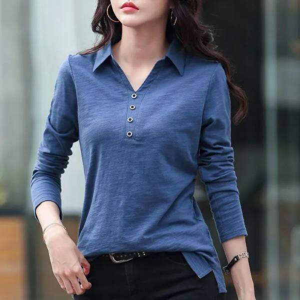 Spring and Autumn New Korean Casual Polo shirt Women Long sleeve Stand Collar T-shirt Loose Plain V neck Comfortable Black t shirts Female Shirts Bottoming Tops Free shipping