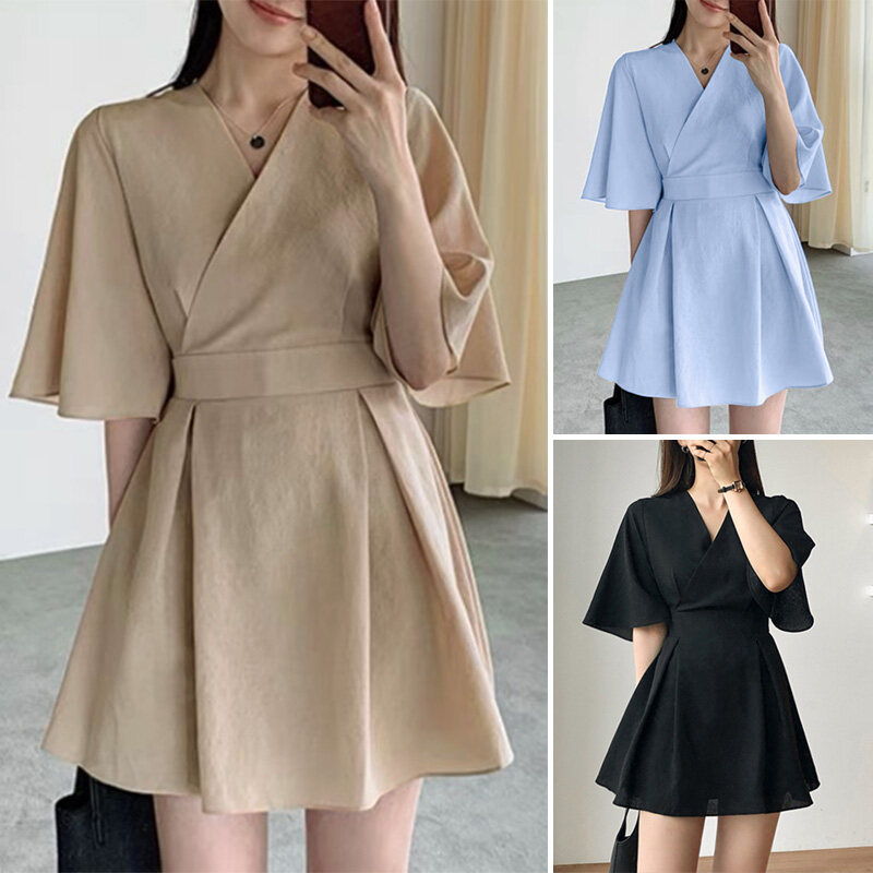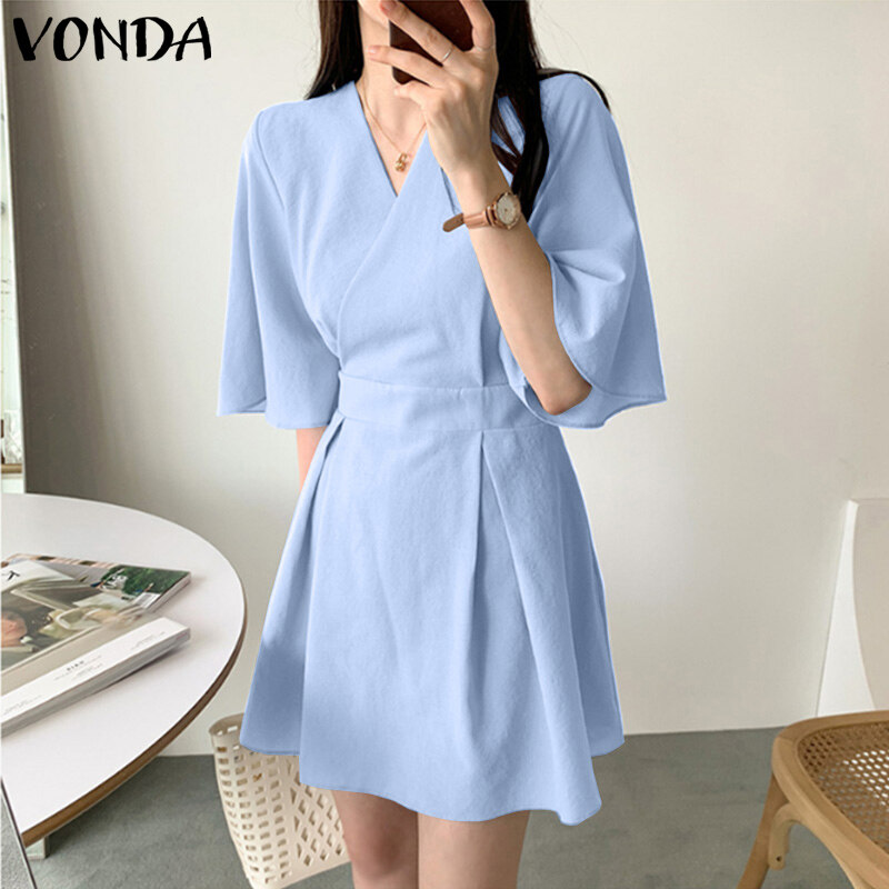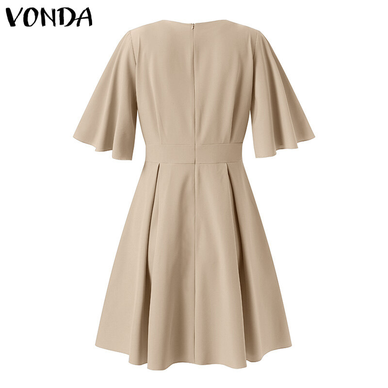 VONDA Women Short Sleeve V Neck Holiday Tunic Dress Fashion Pleated Party Mini Dresses (Korean Causal)