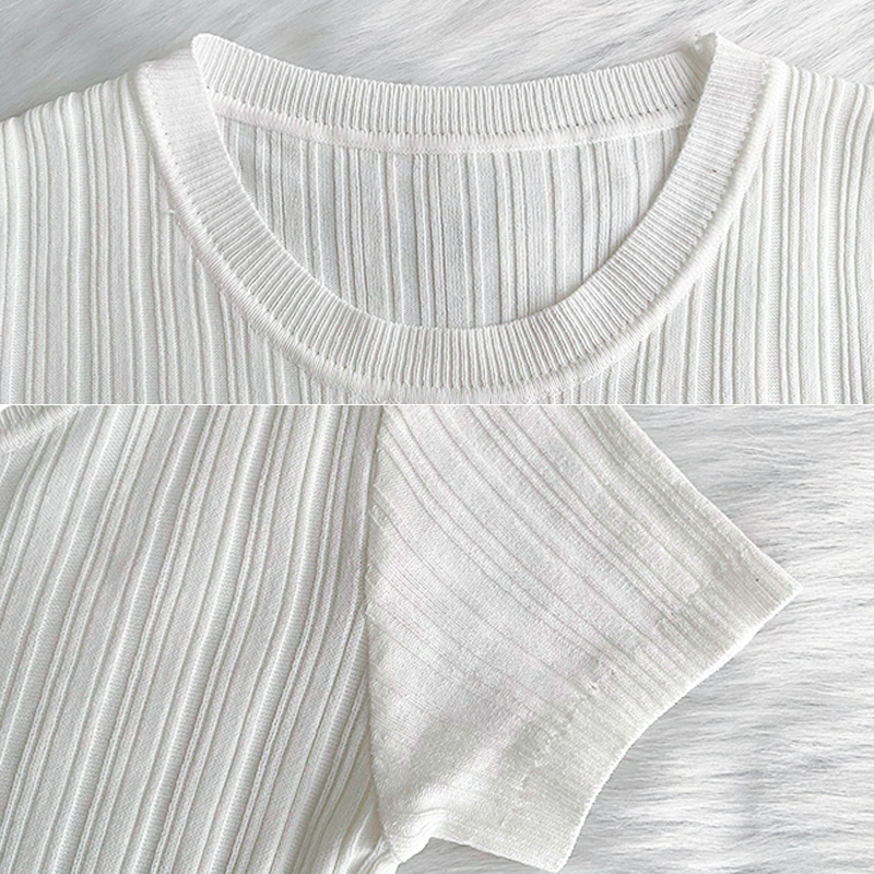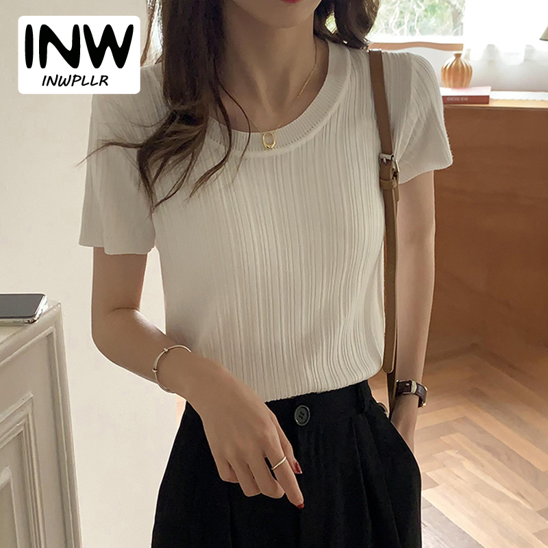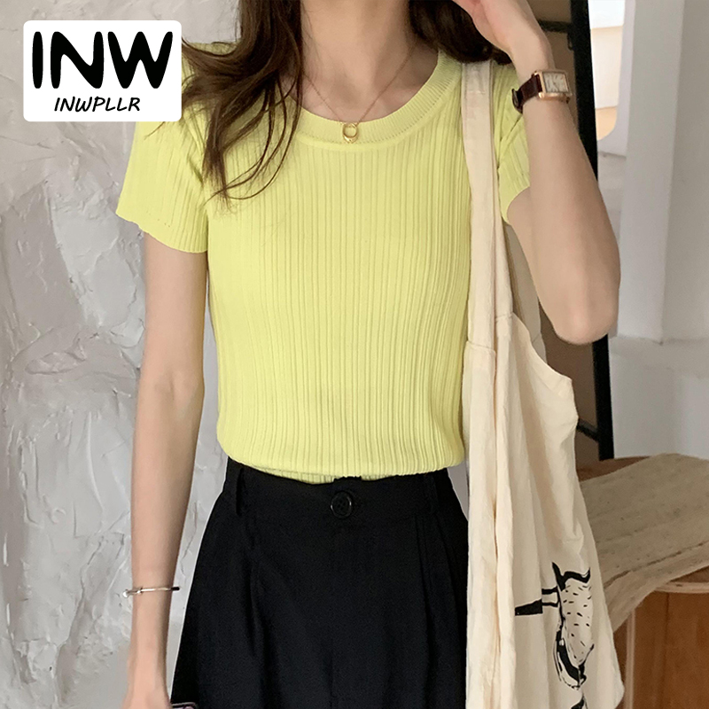 INWPLLR Ice Silk Knitted T-shirts Women Short Sleeved Square-neck Tops Summer All-match Simple Solid Tshirt Ladies