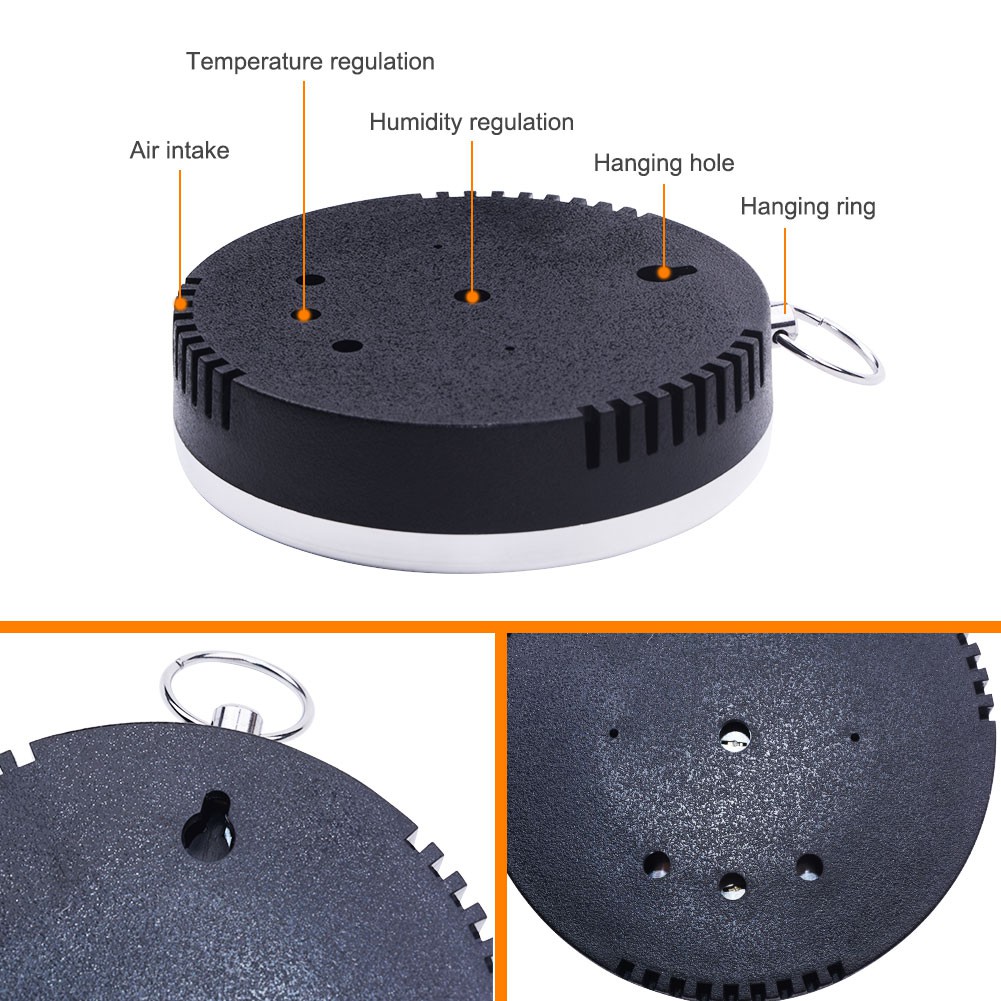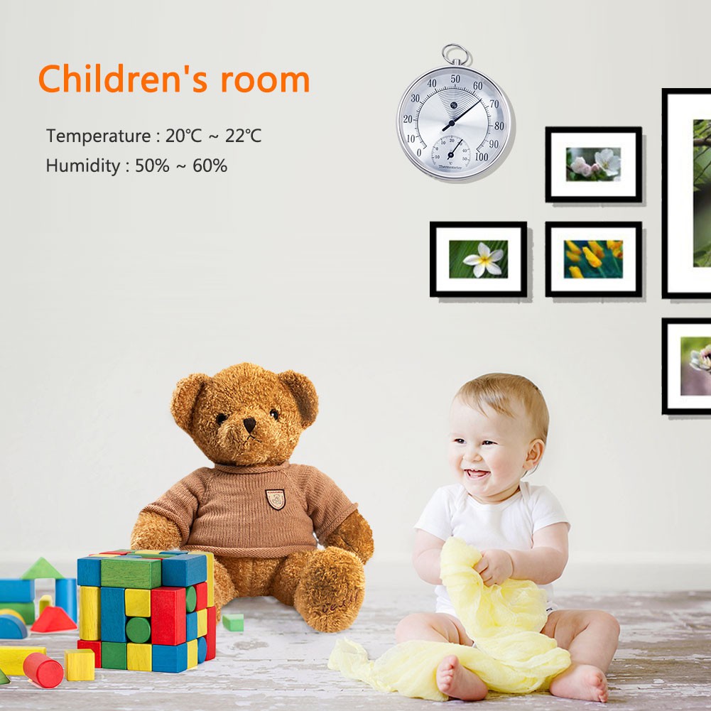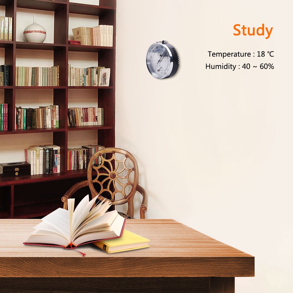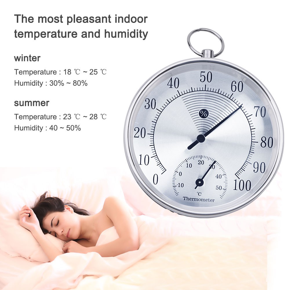 Product Name: 10CM temperature and humidity meter Product function: The product is used to measure the temperature and relative humidity changes of the environment, so that you can keep abreast of changes in the temperature and humidity of the environment, so as to adjust accordingly and improve the quality of life. Product materials: aluminum alloy outer ring oxidized into silver (or gold) color, plastic bottom case, aluminum dial printing, metal pointer, glass lens, copper hanging ring fittings Measuring range: temperature 0 ~ 100% RH, temperature -15 ~ 50C Measurement accuracy: +/-5%RH (40-70%), +/-2C Product size: diameter 100* thickness 25mm Product weight: 0.1KG Product packaging: white box
