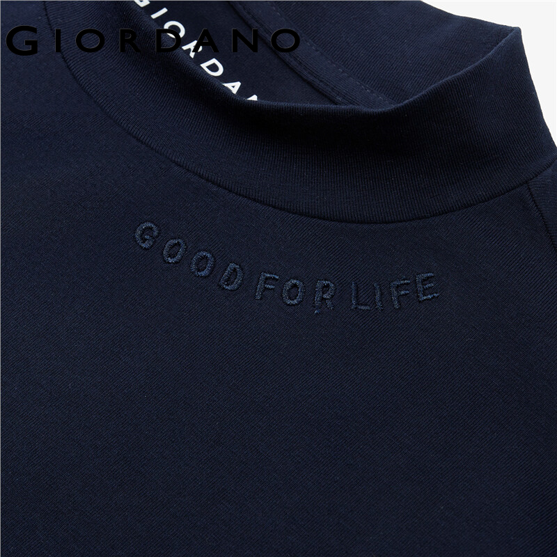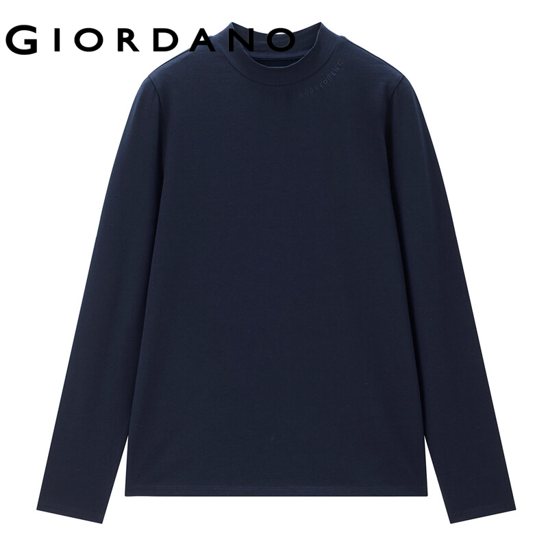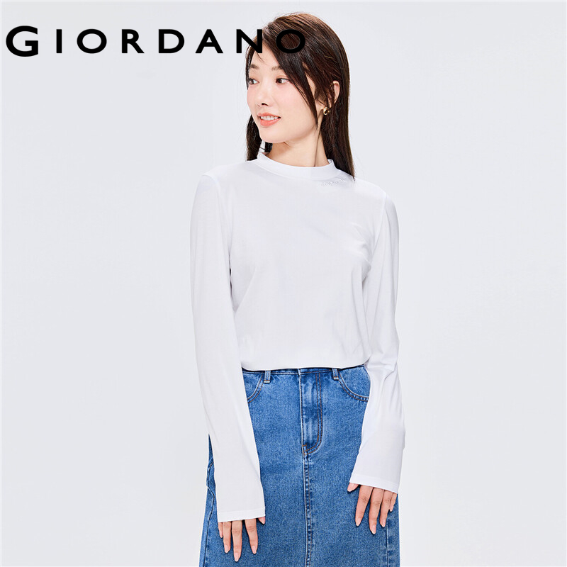 GIORDANO Women T-Shirts Letter Embroidered Stretchy T-Shirts Mockneck Long Sleeve Plain Color Simple Basic Casual Tee 13322564