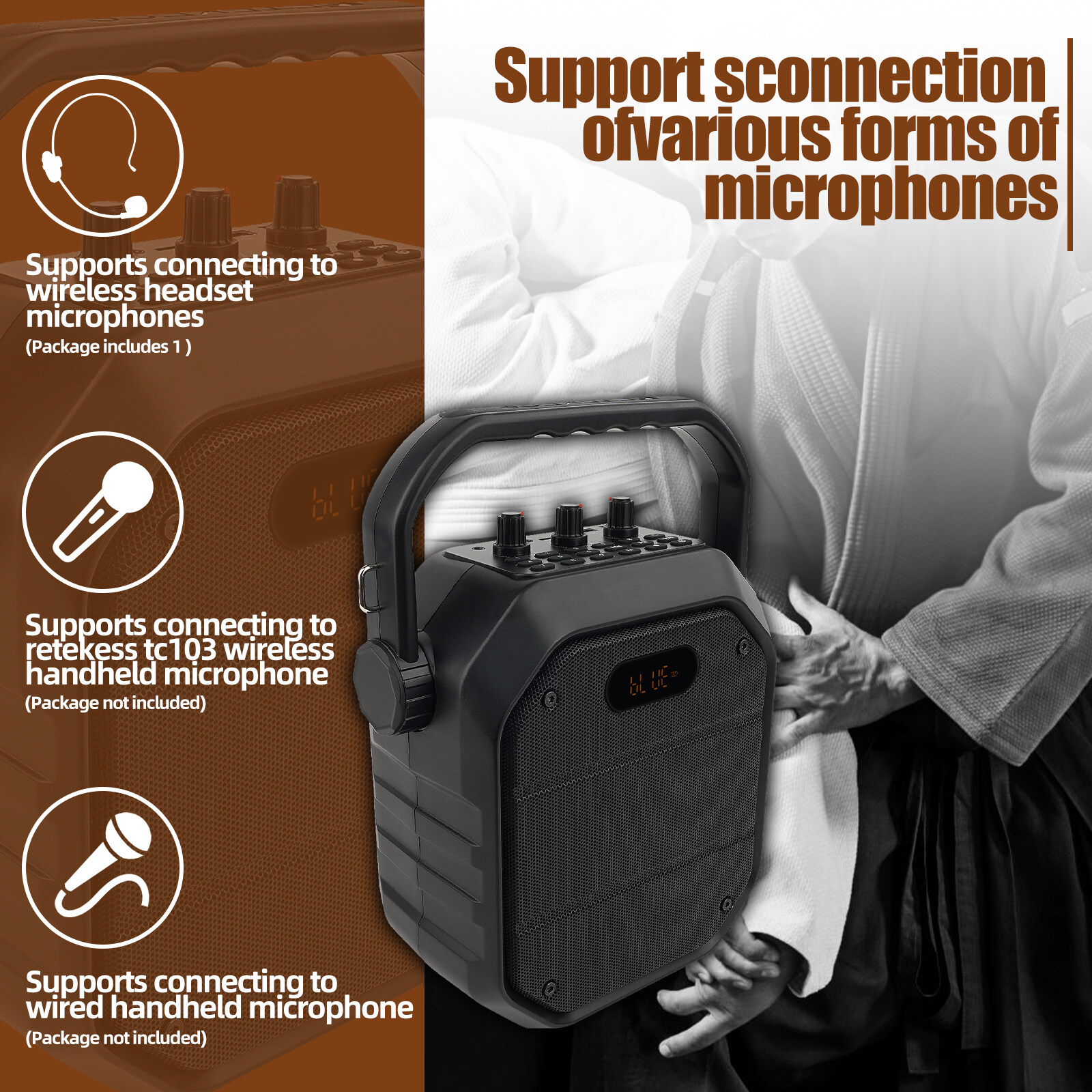 A voice amplifier supports connecting two wireless microphones at the same time (package includes 1),you can also connect to a wired microphone (not included).
