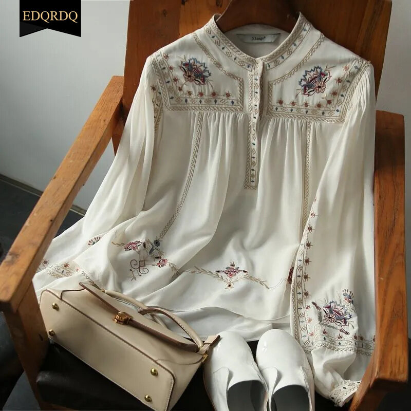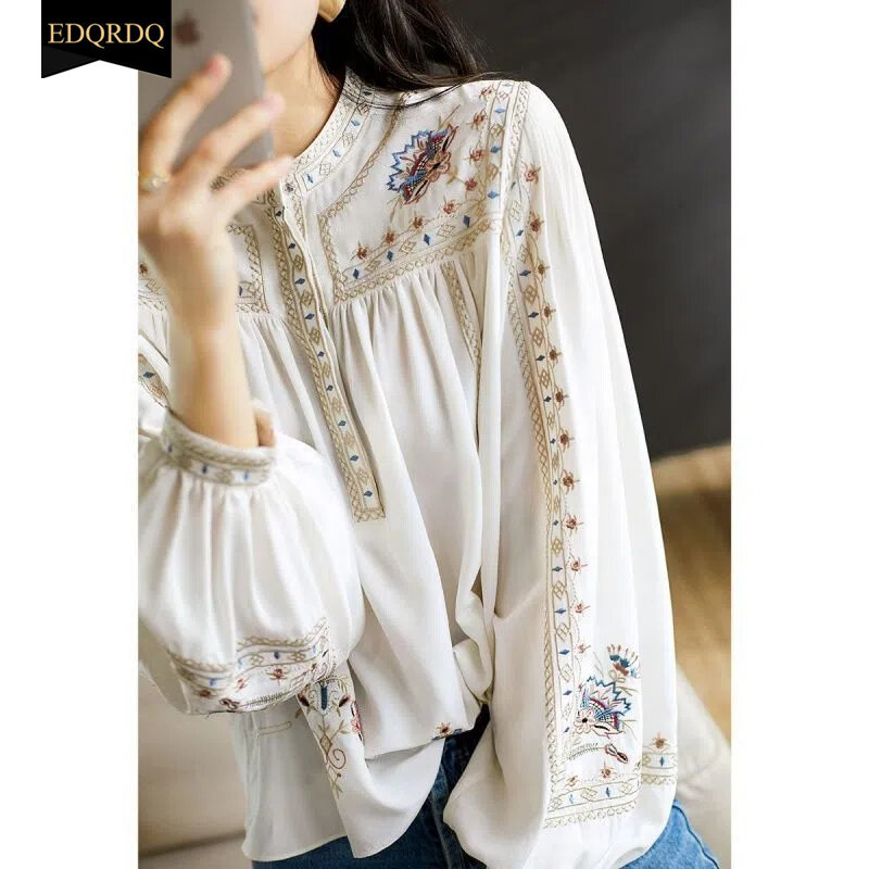 Chinese New Fashion Runway Shirt Chic Embroidered Loose Gauze Shirt Elegant Women's Stand Collar Retro Shirt Tops Quality