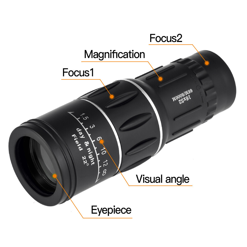 - This monocular offers a 16x magnification and a 52mm objective diameter.