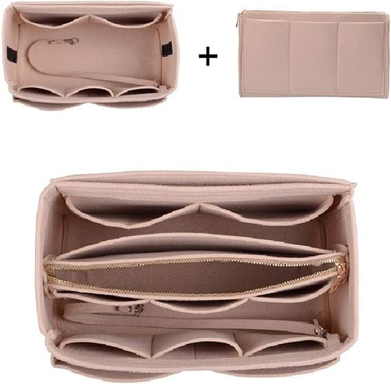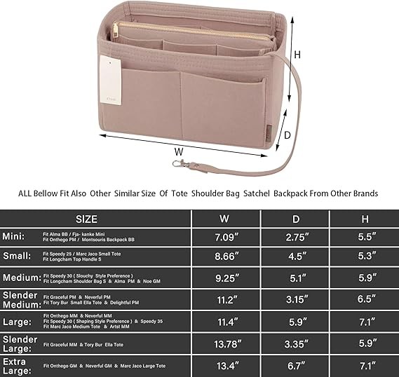 Bag Organizer Dimensions: Mini Wallet Organizer: 7.09 (W) * 5.5 (H) * 2.75 (D) inches, fits the Alam BB and Fja-Kanke Mini; Onthego PM and Montsouris BB. Small Wallet Organizer: 8.66 (W) * 5.3 (H) * 4.5 (D) inches, fits the MJ Small Handbag, Speedy 25, LC Op Handle S, and the New Small School Bag. The Medium Wallet Organizer measures 9.25 inches wide, 5.9 inches high, and 5.1 inches deep, perfect for a 30 (preferred for a relaxed style). The Slim Medium Wallet Organizer measures 11.2 inches wide, 6.5 inches high, and 3.2 inches deep, perfect for a sophisticated PM.